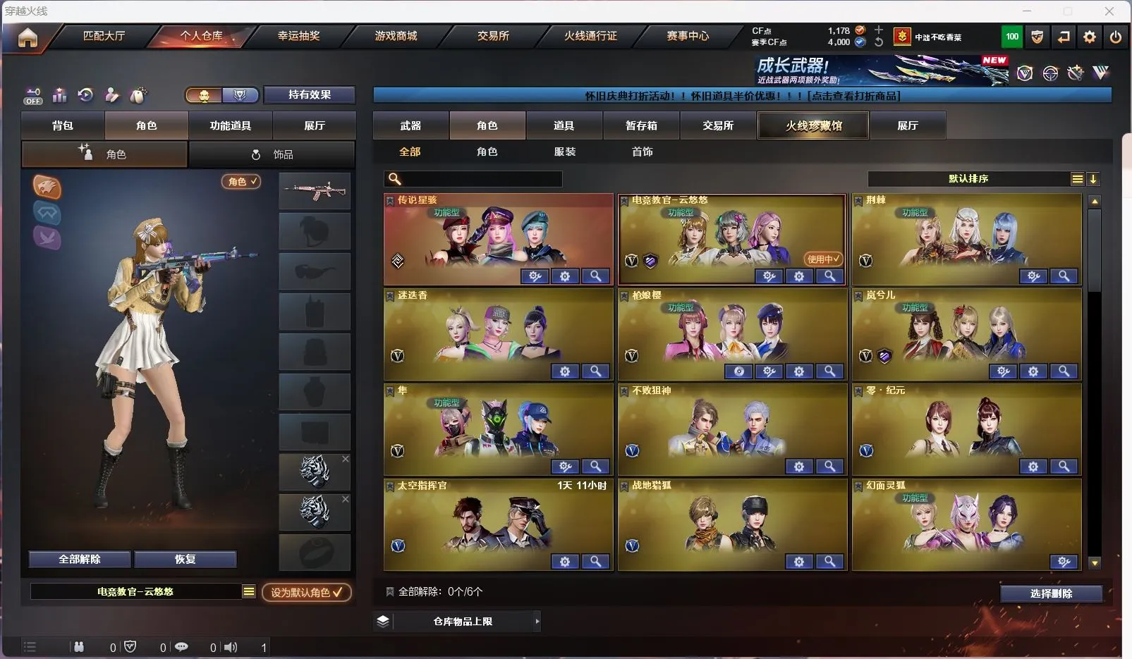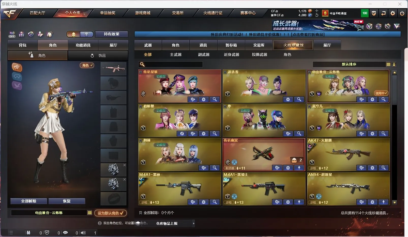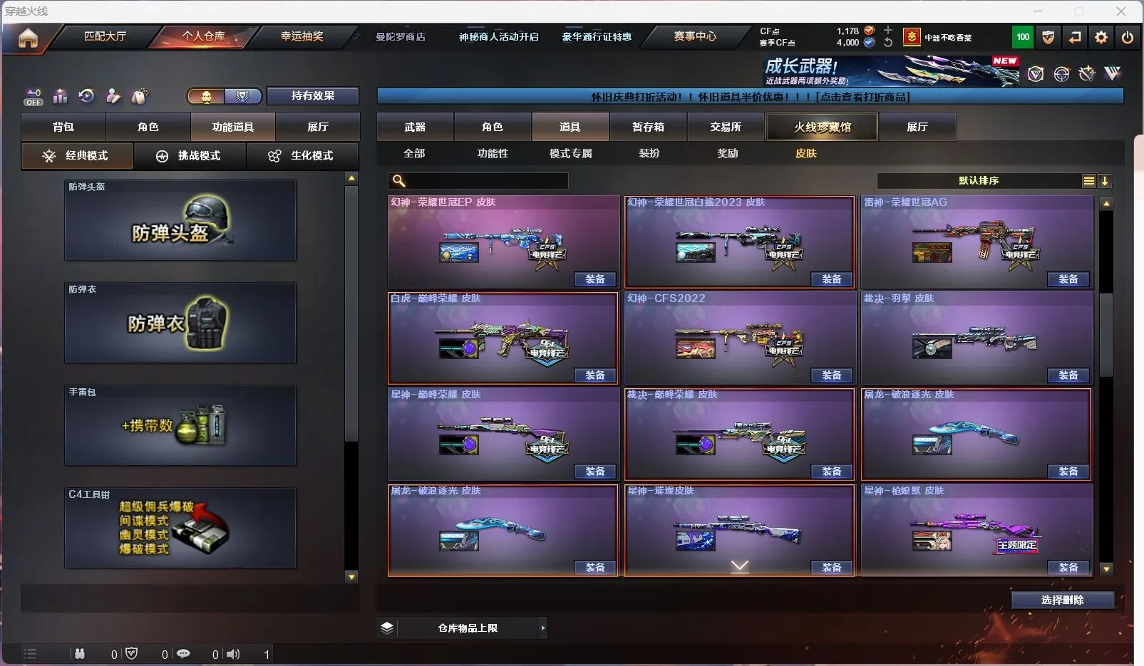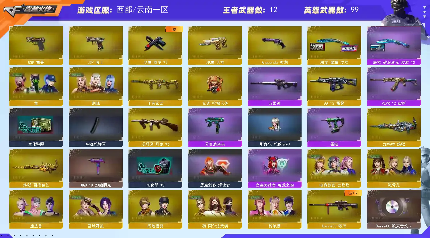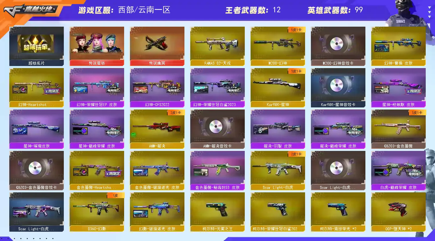 幻神5皮带卡 星神三件套 裁决三件套 白虎三件套 生化满配】【传说星骇】【m200幻神+幻神音效卡+女团+曹操+荣耀世冠ep+cfs2022+荣耀世冠白鲨2023 】【98k星神+星神音效卡+巅峰荣耀+璀璨 +枪娘 】【m200竞技荣光套+usp雷暴+四防云悠悠】【王者星神】【6烈龙 炼狱*2 异变清道夫 斯太尔枪娘暗刃 隼】【传说幽冥】【g36c幻影+破浪逐光】【scar白虎+白虎音效卡+巅峰荣耀 】【qbz金色蔷薇+卡+女团】【qbz天罚】【银翼 天戎 朱雀】【火麒麟+卡+女团】【雷神+荣耀世冠+荣耀之魄】【黑骑士+卡+冠军之势】【毁灭+卡+sv16噶冠军】【裁决 +裁决音效卡 +巅峰荣耀】【堕天神套装/竞技荣光套装】【武器:堕天神 凌龙 王者之魄 荣耀世冠雷神 qbz王者蔷薇 白虎电玩 白虎之魄 王者玄武 】【12手枪:修罗*3 天神 雷暴 堕天神*2 竞技荣光*2 usp冥王 柯尔特荣耀世冠白鲨 柯尔特无冕之王 玄豹 】【14刀具:屠龙*3 擎天 麒麟刺 堕天神 玄豹 竞技荣光 麒麟刺 王者之啸 雷霆王者之锋 王者冰锋 】【9雷套:堕天神*7 竞技荣光 玄豹雷 】【小人枪:雷神精英刀锋 火麒麟灵狐 玄武枪娘火莲 炼狱秦师 】【音效卡:星神音效卡 火麒麟音效卡 金色蔷薇音效卡 幻神音效卡 裁决音效卡 白虎音效卡 黑骑士音效卡 毁灭音效卡 】【四防角色:云悠悠 岚兮儿】