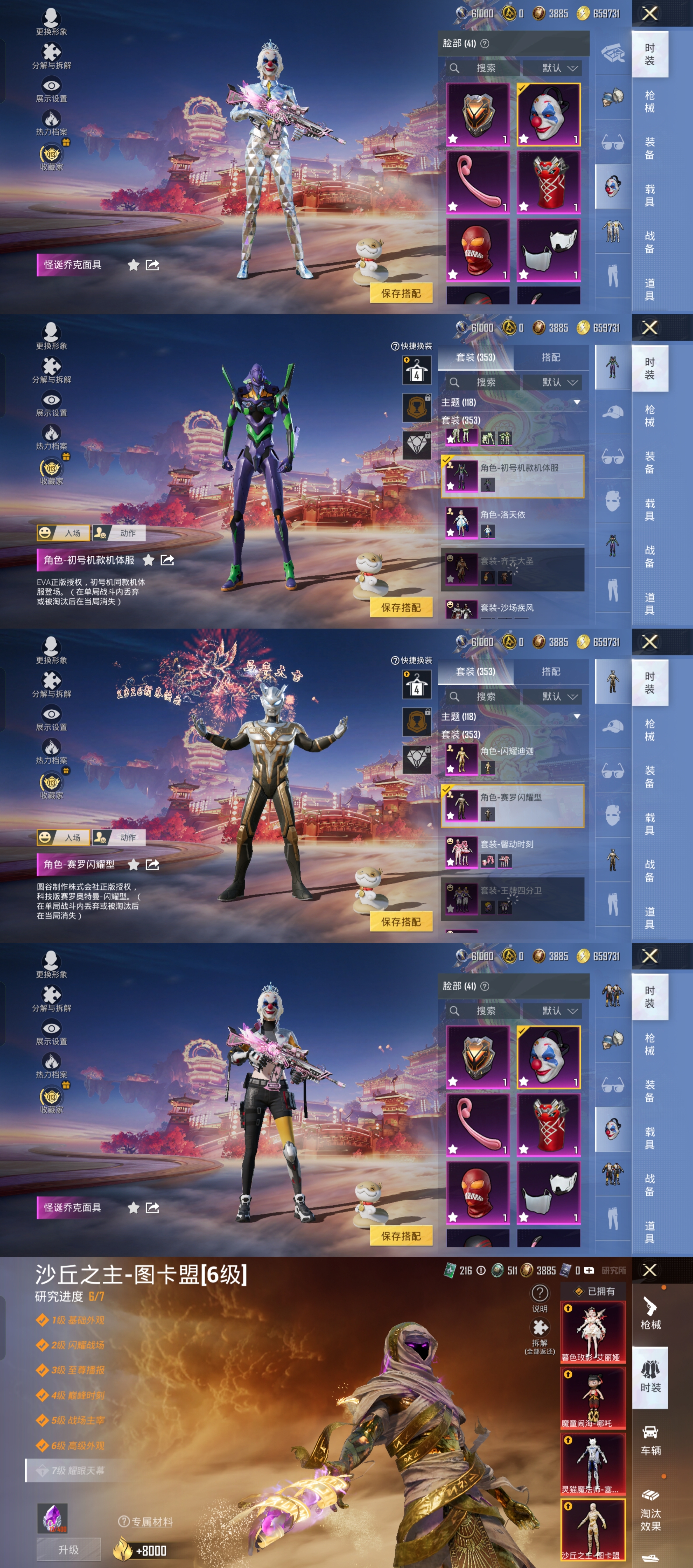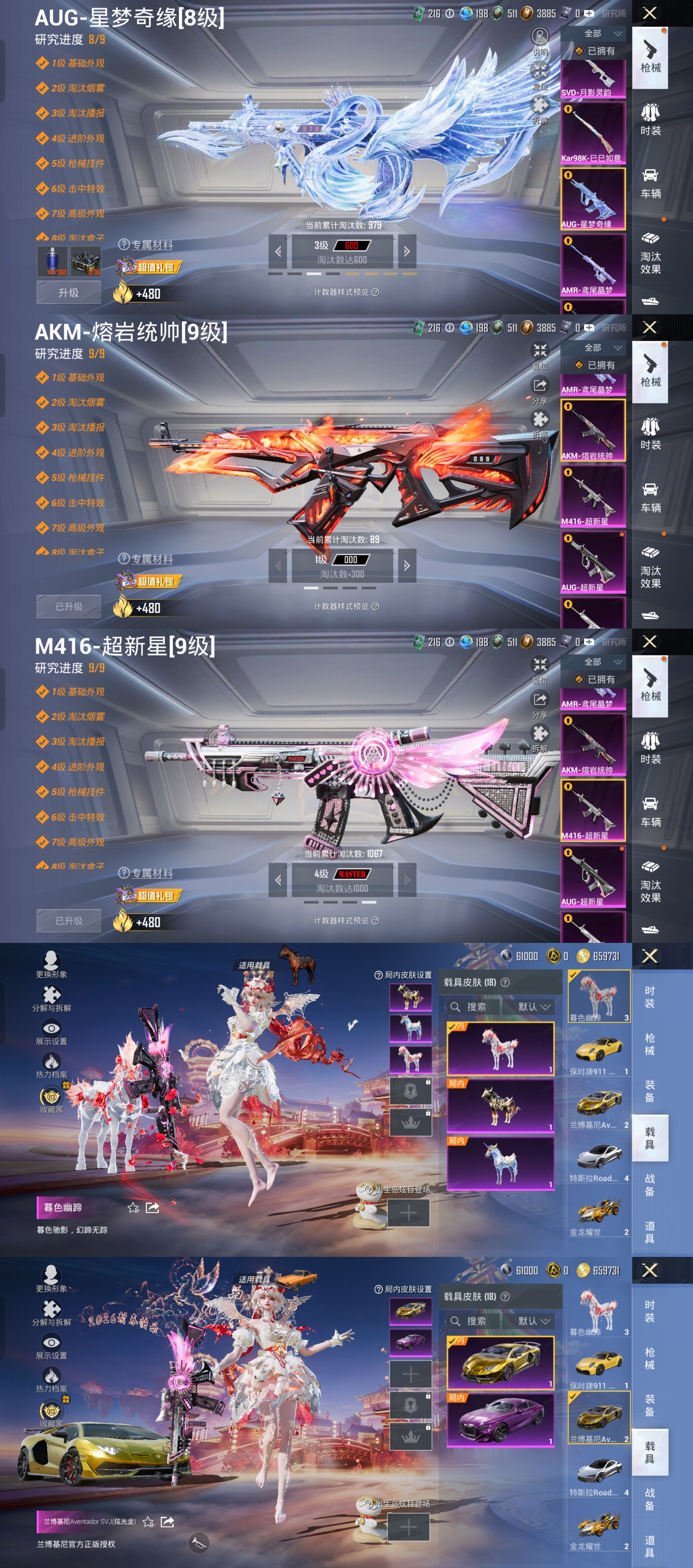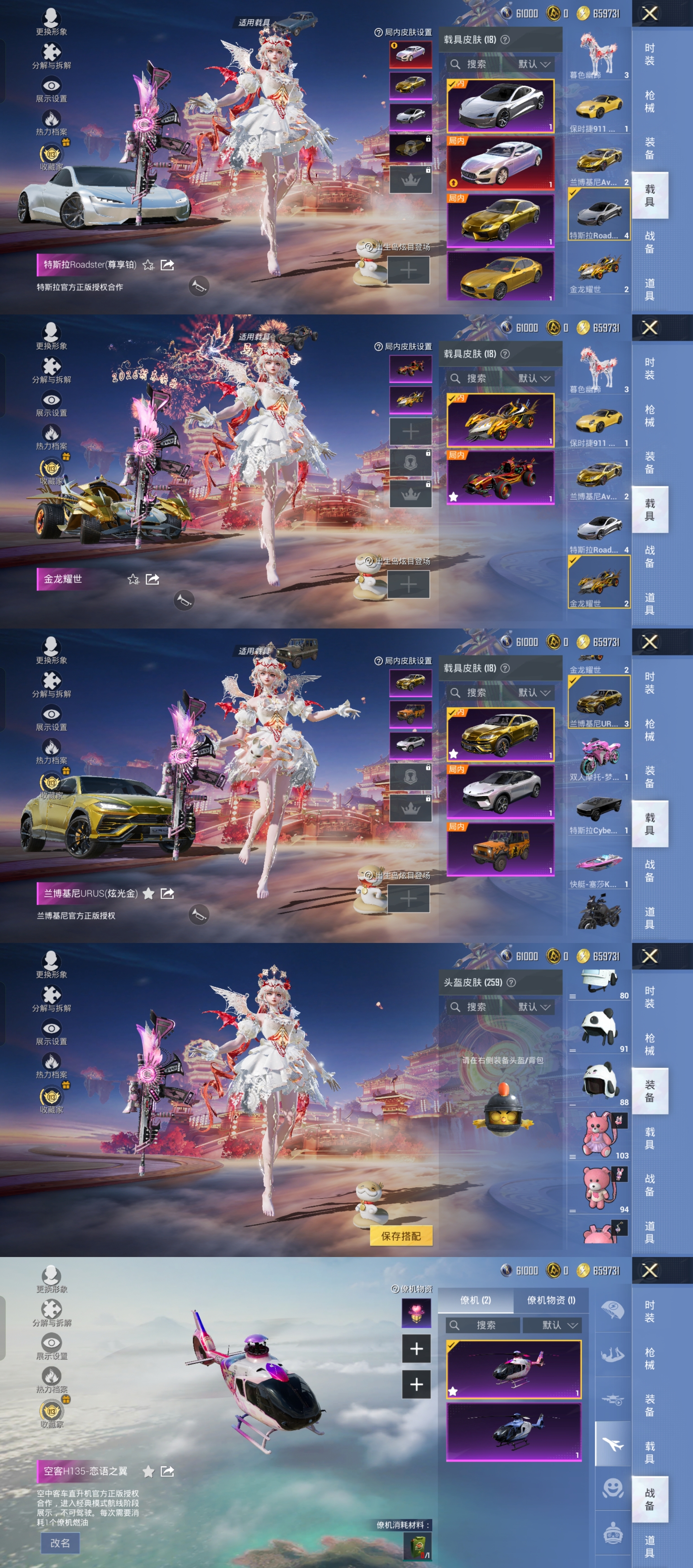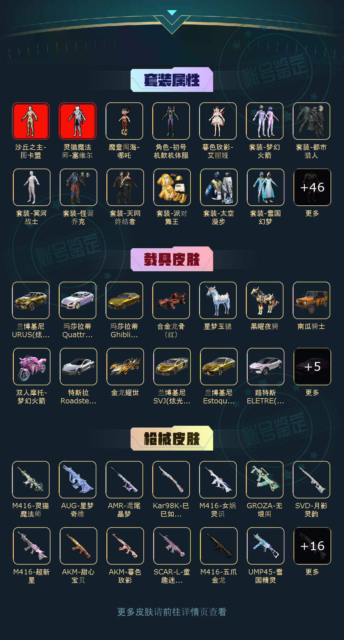 54粉,18载具,29特效枪,353套装,22王牌印记 AKM-甜心宝贝/DP-28-扶摇飞仙/SCAR-L-童趣迷兔/M416-风花雪月/GROZA-香水柠檬/M416-心之恋语/M416-五爪金龙/MG3-洛神天依/SLR-暗夜玫瑰/UMP45-雪国精灵/M762-甜蜜誓约/玛莎拉蒂Ghibli(金)/兰博基尼URUS(炫光金)/特斯拉Roadster(尊享铂)/双人摩托-梦幻火箭/特斯拉Cybertruck(极昼黑)/兰博基尼Estoque(炫光金)/金龙耀世/快艇-塞莎KL27(霓虹粉)/路特斯ELETRE(花绽灰)/南瓜骑士/合金龙骨(红)/兰博基尼SVJ(炫光金)