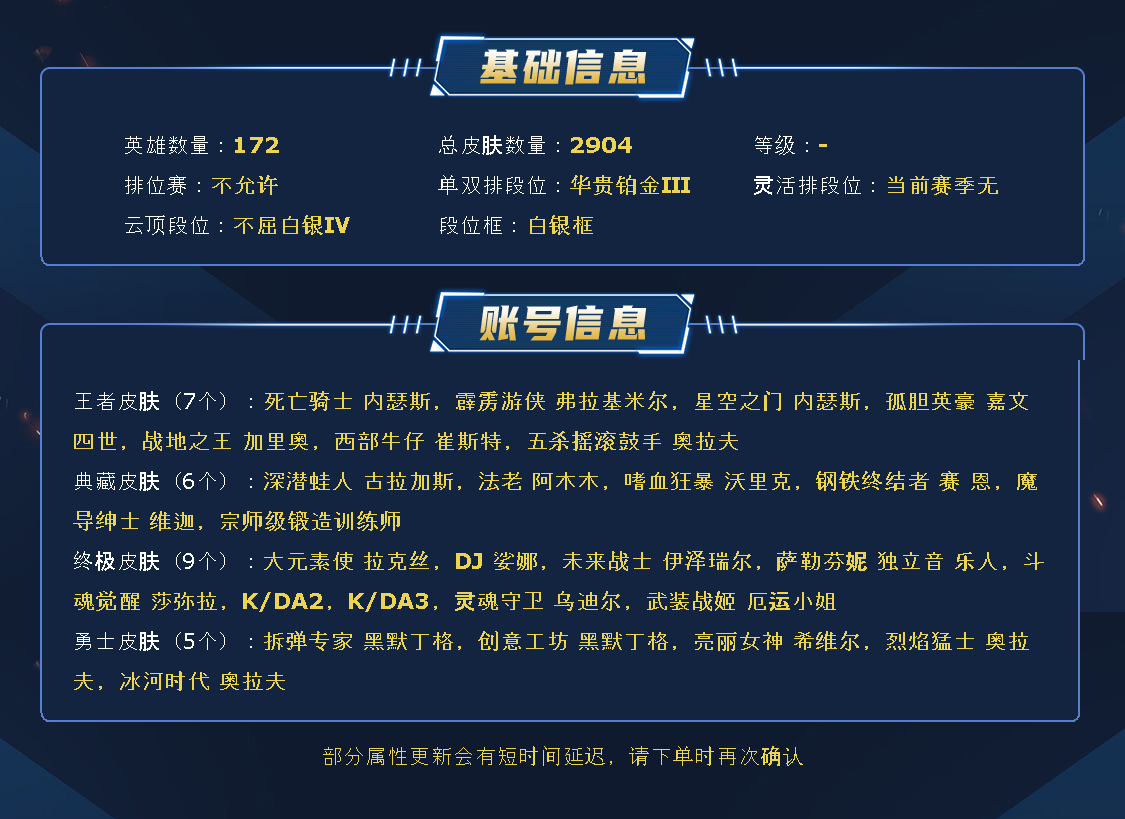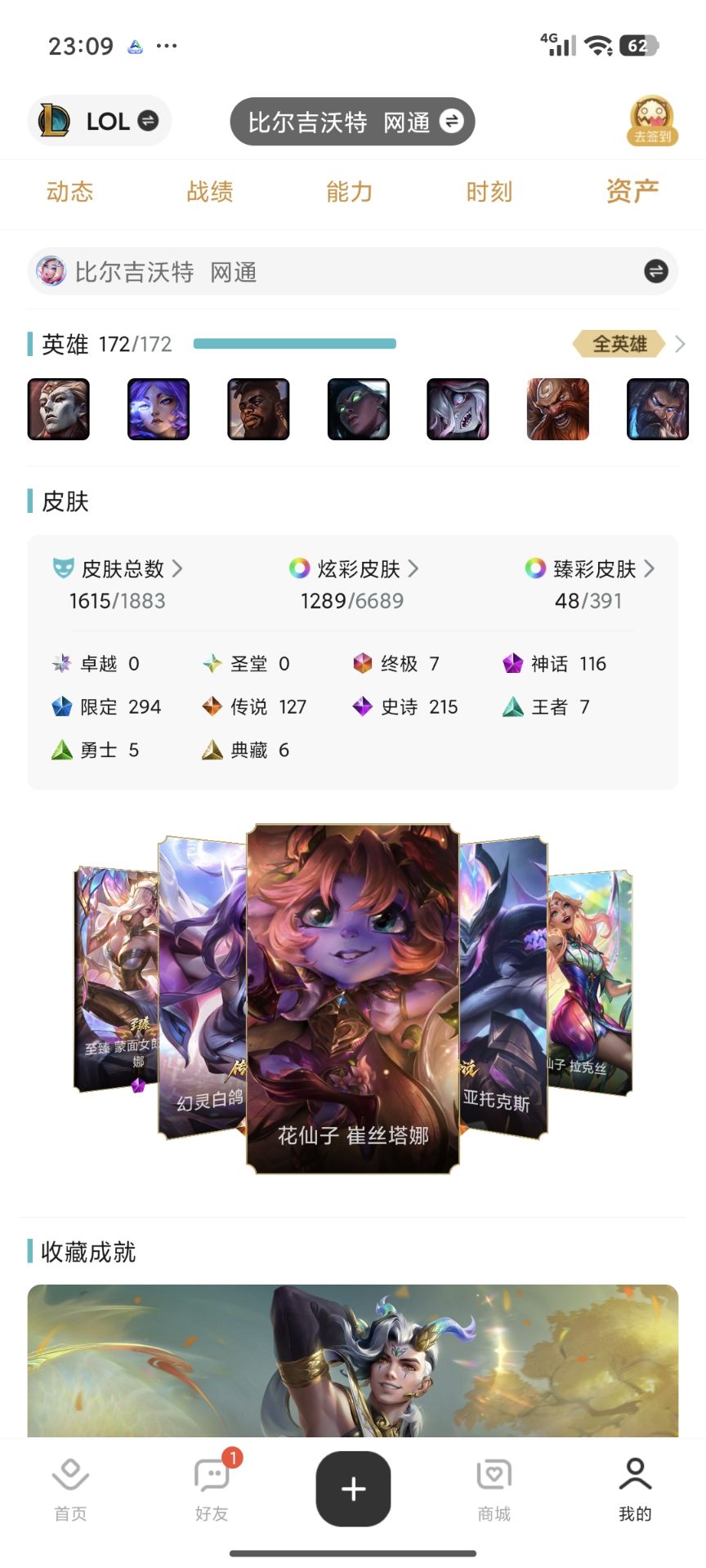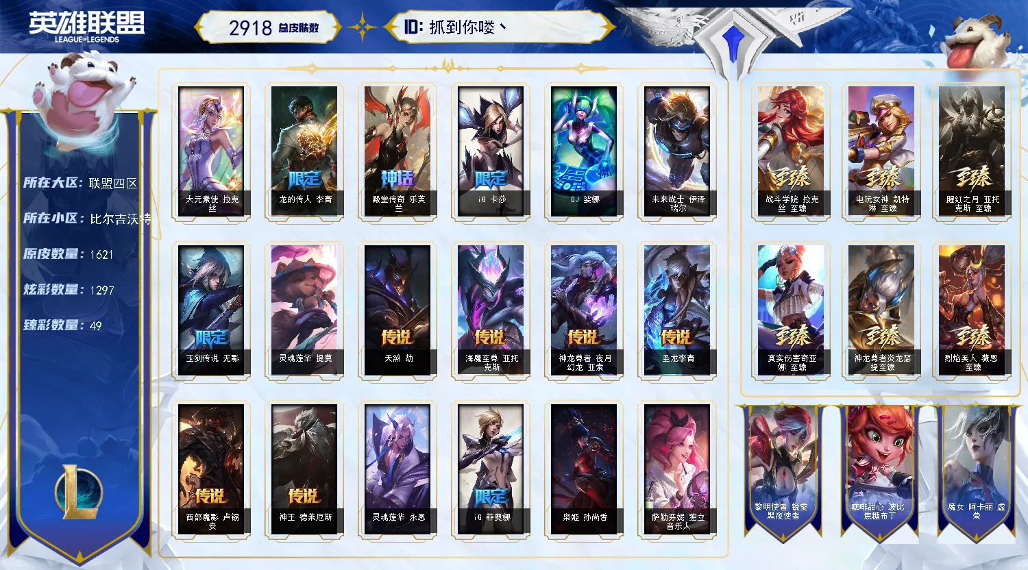 比尔吉沃特2900皮丨1615原皮丨1289炫彩丨294限定丨116神话丨48臻彩