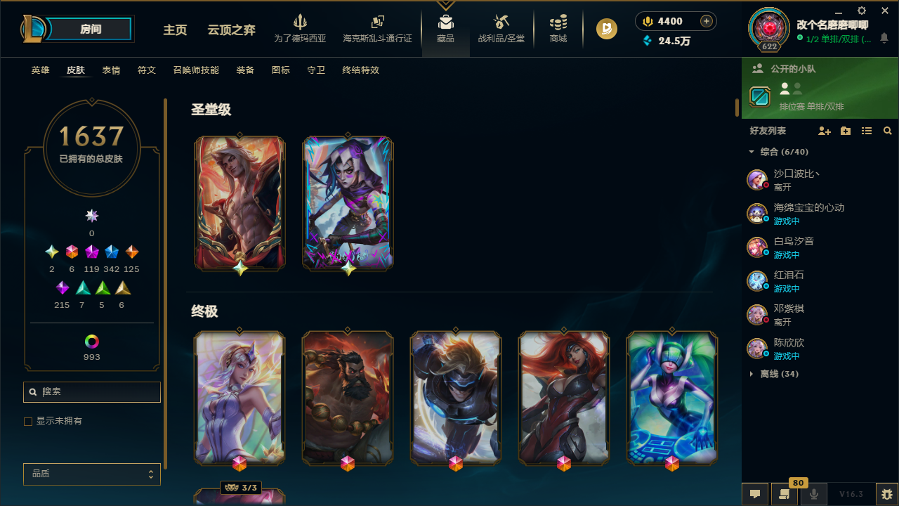 艾欧尼亚2600皮丨1637原皮丨圣堂金克斯腕豪丨1005炫彩丨342限定丨119神话丨90臻彩