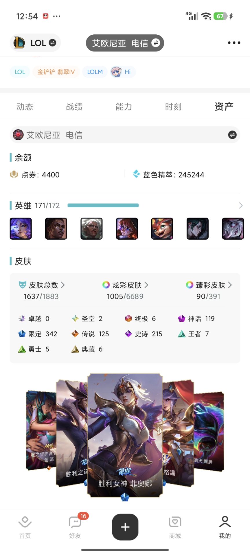 艾欧尼亚2600皮,1637原皮4色龙瞎,圣堂金克斯腕豪,119神话,90张臻彩。342限定等。