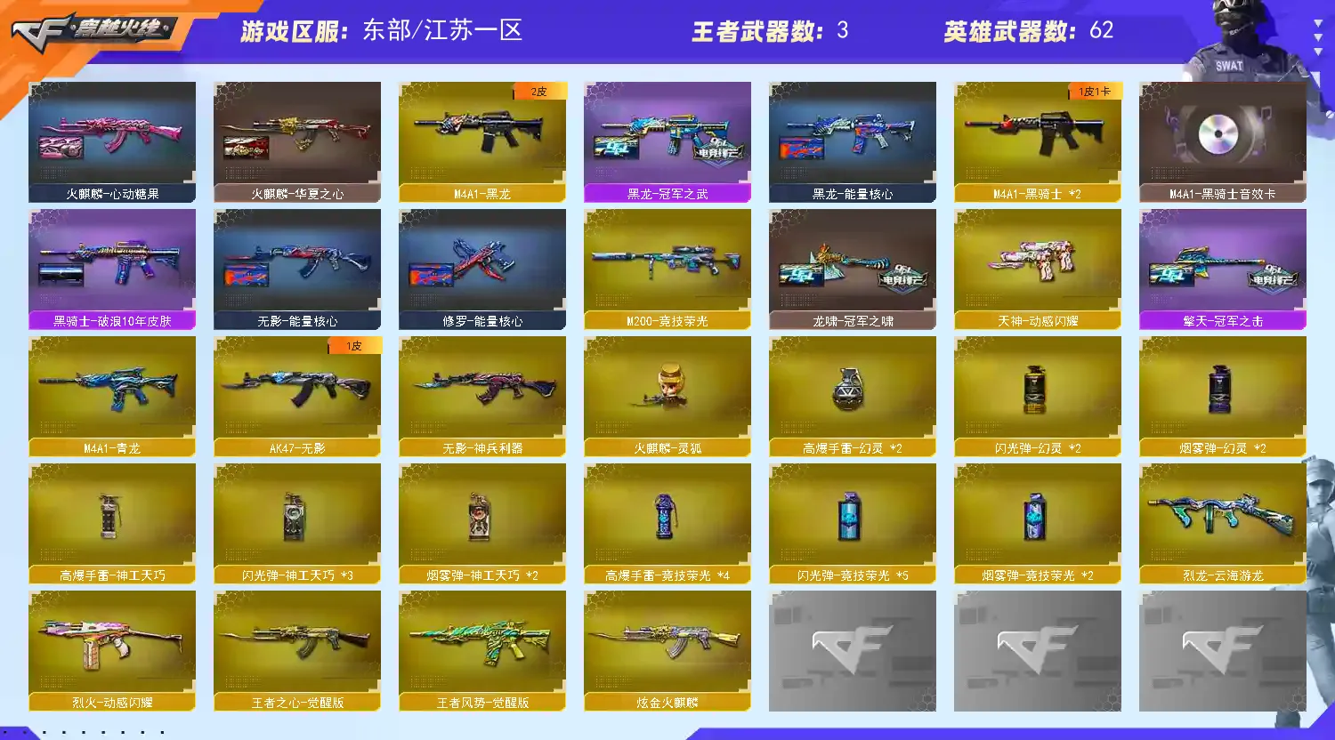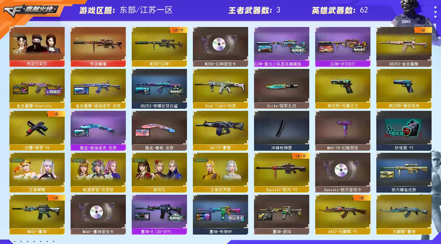 【四防传说艾莉莎】【传说幽瞳】【m200幻神+幻神音效卡+cfs2022+星火小队+冠军之刃 】【m200竞技荣光套+四防云悠悠】【scar白虎】【qbz金色蔷薇+女团+荣耀世冠白鲨】【火麒麟】【黑龙+冠军之武】【雷神+卡+s18冠军+n9皮肤】【黑骑士+卡】【毁灭+卡 】【武器:青龙 王者之心 王者风势 烈龙】【7手枪:修罗*4 竞技荣光 天神 柯尔特无冕之王】【9刀具:屠龙 龙啸 擎天 麒麟刺 竞技荣光*2 王者云击 龙啸 】【5雷套:幻灵雷*2 竞技荣光*2 神工天巧雷】【小人枪:朱雀蛇隐宗 雷神精英刀锋 火麒麟灵狐 雷神小红 毁灭孙三炮】【音效卡:毁灭音效卡 幻神音效卡 雷神音效卡 黑骑士音效卡 】【四防角色:云悠悠 岚兮儿 王者炽天使 王者晴雅 】