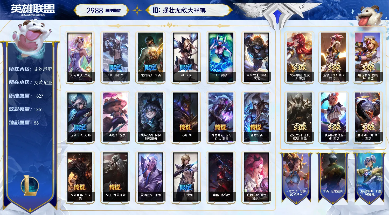 艾欧尼亚2900皮丨1625原皮丨1360炫彩丨351限定丨115神话丨55臻彩丨7终极