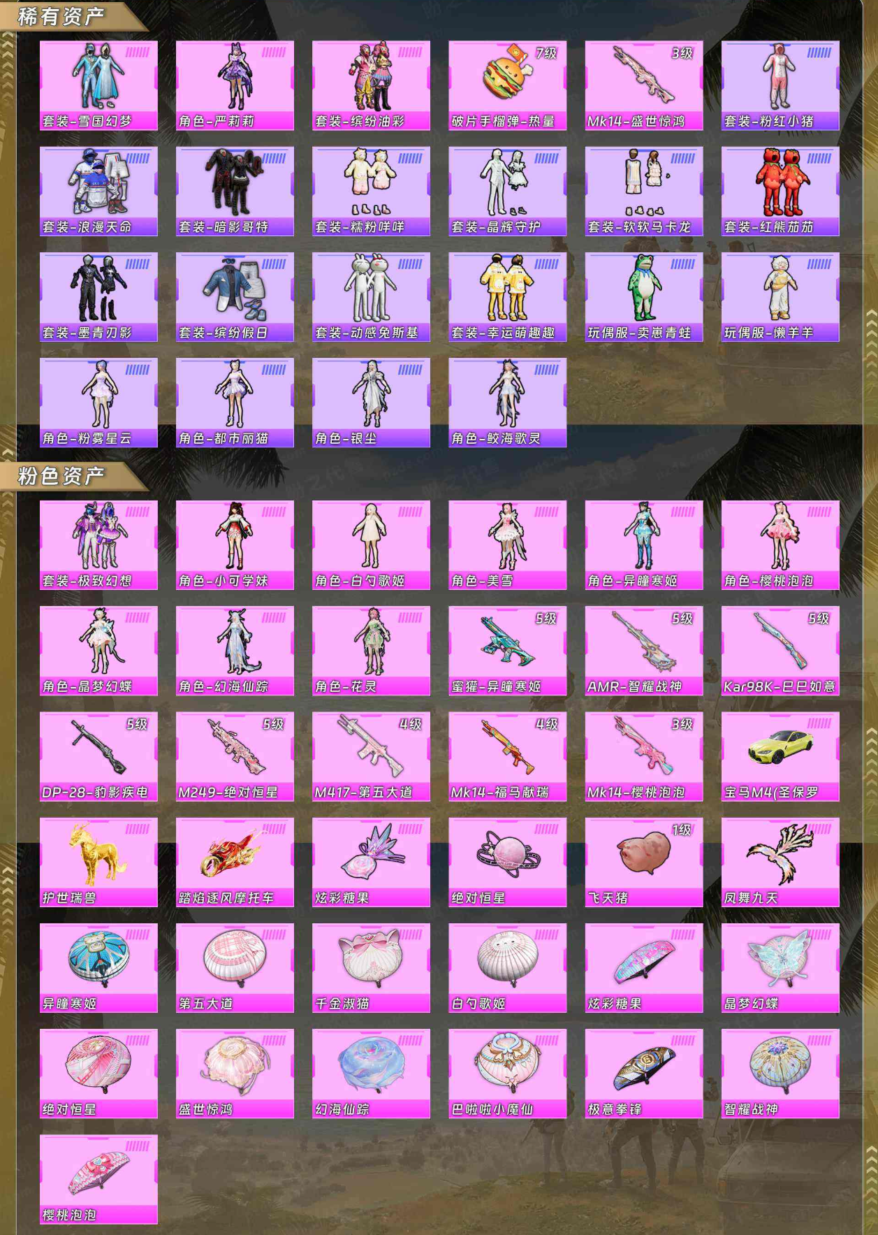 【稀有资产】套装-雪国幻梦/角色-严莉莉/套装-缤纷油彩/破片手榴弹-热量炸弹/Mk14-盛世惊鸿/套装-粉红小猪/套装-浪漫天命/套装-暗影哥特/套装-糯粉咩咩/套装-晶辉守护/套装-软软马卡龙/套装-红熊茄茄/套装-墨青刃影/套装-缤纷假日/套装-动感兔斯基人偶服/套装-幸运萌趣趣/玩偶服-卖崽青蛙/玩偶服-懒羊羊/角色-粉雾星云/角色-都市丽猫/角色-银尘/角色-鲛海歌灵