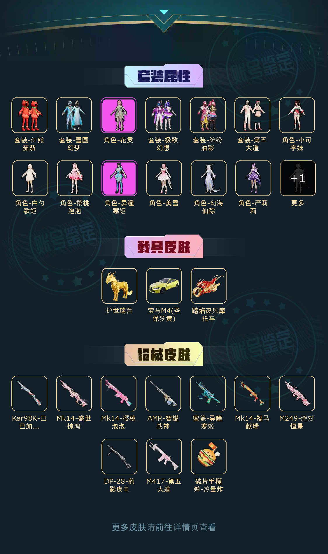 【粉色枪皮】蜜獾-异瞳寒姬/AMR-智耀战神/Kar98K-巳巳如意/DP-28-豹影疾电/M249-绝对恒星/M417-第五大道/Mk14-福马献瑞/Mk14-樱桃泡泡