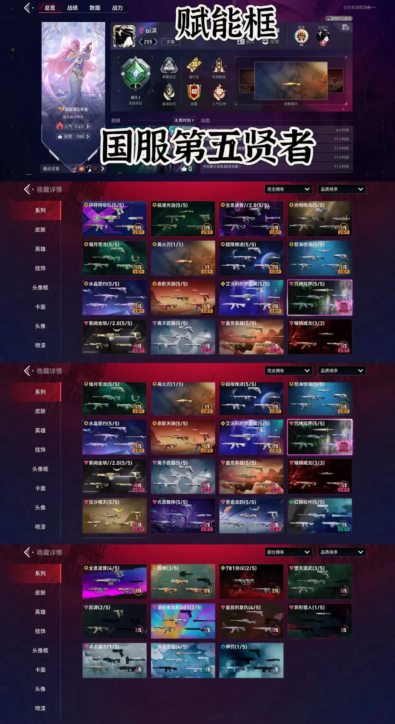 【全平台】 挂机禁言炸鱼必拉黑✨40级收藏家✨赋能框国服第五奶妈🈵27件🈵离火刃马年套水晶誓约套威龙套