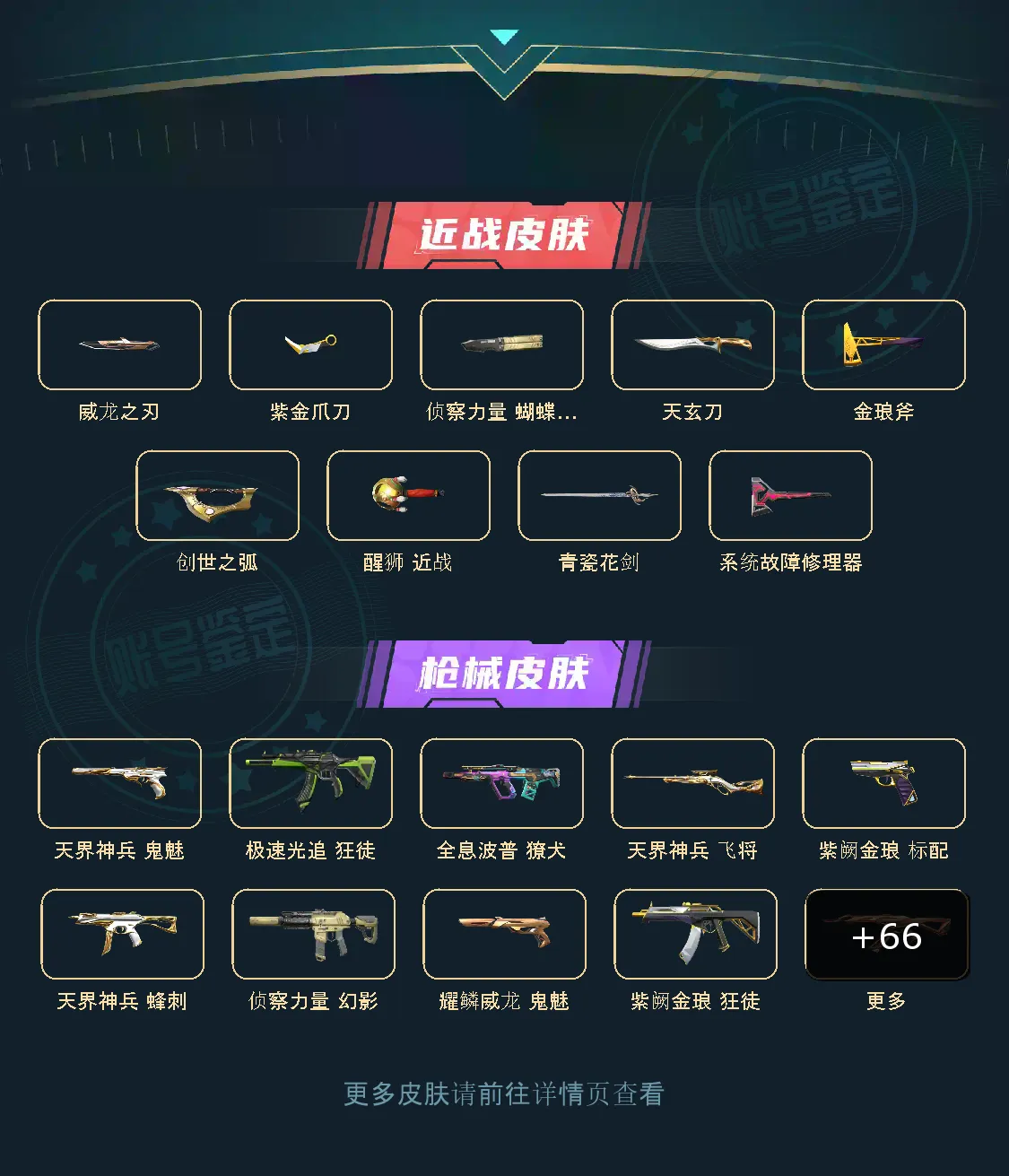 满级侦查幻影,满级醒狮幻影,满级紫金狂徒,满级盖亚狂徒,满级显卡狂徒,满级狂沙狂徒,满级全息獠犬,满级天界戍卫,满级醒狮判官,满级天界蜂刺,满级醒狮正义,满级天界鬼魅,满级紫金标配,满级威龙之刃,满级侦查蝴蝶刀,满级紫金爪刀,满级天玄刀,满级金琅斧,满级醒狮破