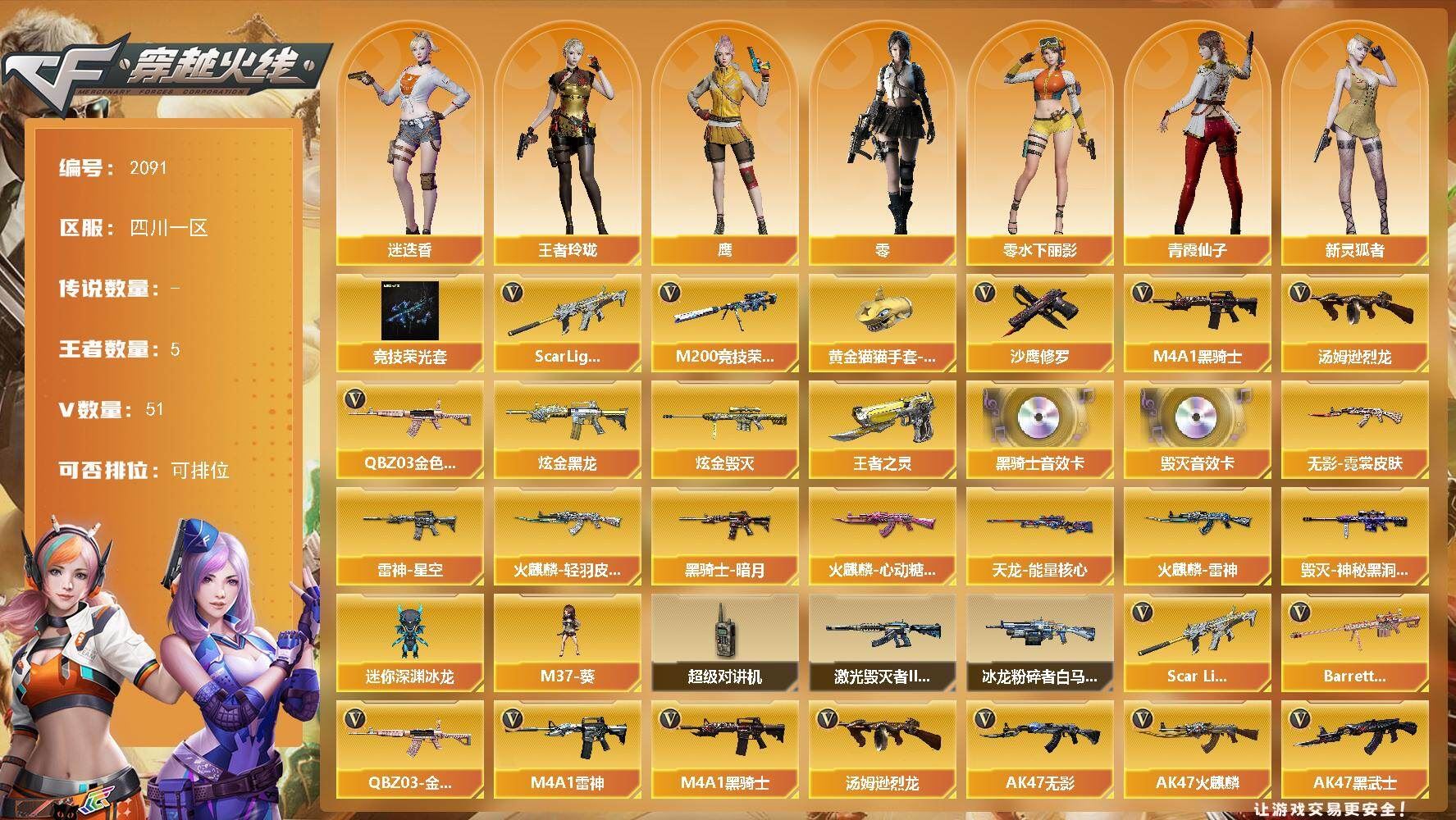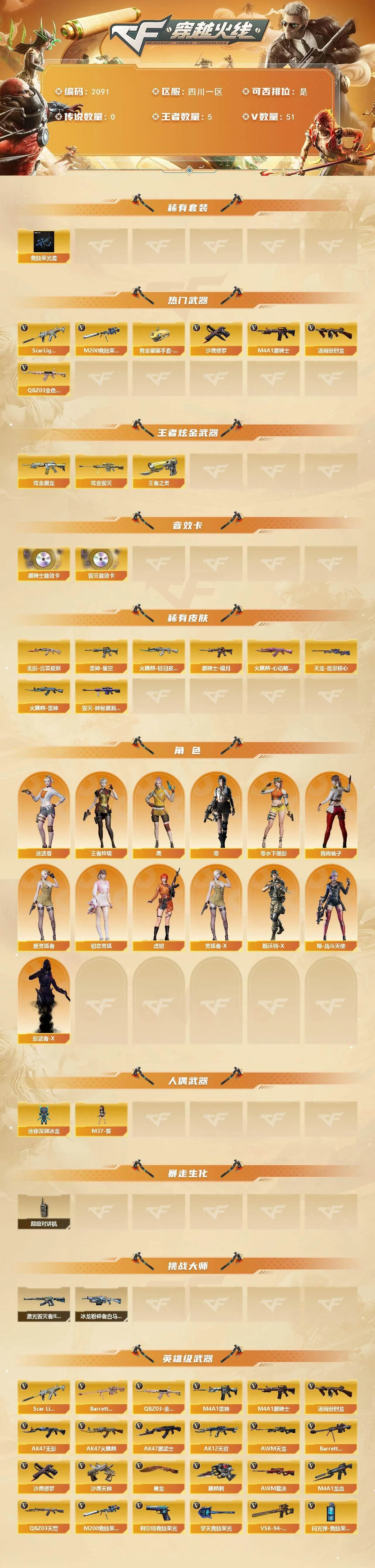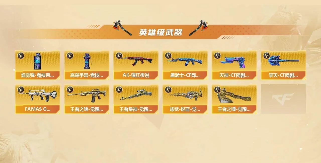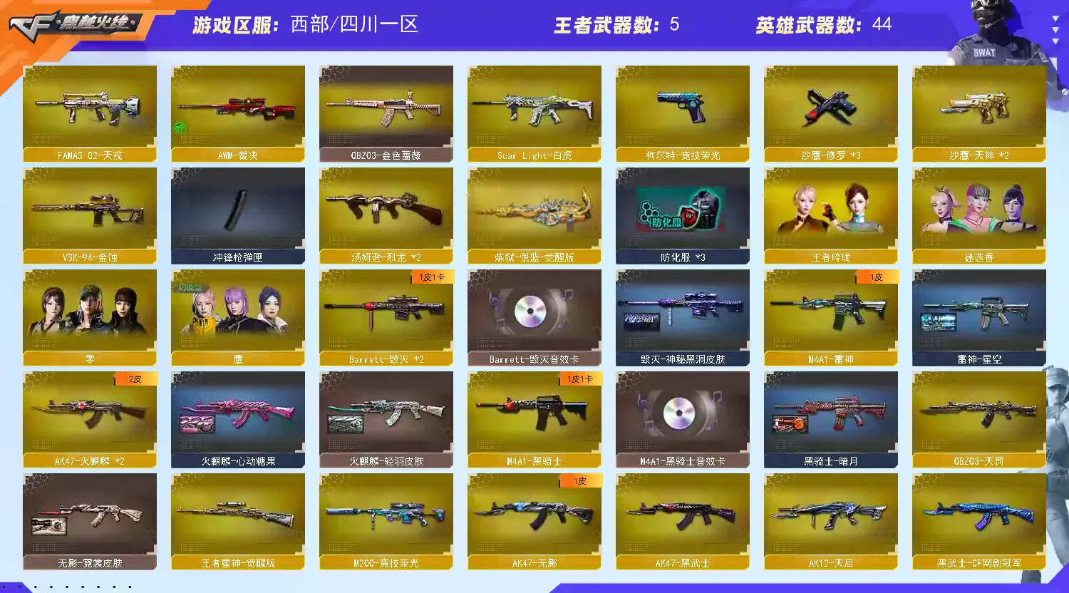 【热门武器】:QBZ03-金色蔷薇,Scar Light-白虎,M200-竞技荣光,M4A1-黑骑士,汤姆逊-烈龙*2,沙鹰-修罗*3,黄金猫猫手套-白鲨【王者炫金武器】:王者之灵,炫金黑龙,炫金毁灭【音效卡】:M4A1-黑骑士音效卡,Barrett-毁灭音效卡【皮肤】:雷神-星空,火麒麟-雷神,火麒麟-轻羽皮肤,火麒麟-心动糖果,毁灭-神秘黑洞皮肤,黑骑士-暗月,无影-霓裳皮肤,天龙-能量核心【角色】:零,迷迭香,鹰,王者玲珑,初恋灵狐,虎妞,零-水下丽影,灵狐者-X,青霞仙子,斯沃特-X,新灵狐者,樱-战斗天使,影武者-X【人偶武器】:M37-葵,迷你深渊冰龙【暴走生化】:超级对讲机【挑战大师】:冰龙粉碎者-白马银枪,激光毁灭者III-白马银枪【英雄级武器】:AK47-火麒麟*2,M4A1-雷神,M4A1-黑骑士,AK47-无影,AK47-黑武士,AK12-天启,M4A1-龙血,Scar Light-白虎,QBZ03-天罚,FAMAS G2-天戎,QBZ03-金色蔷薇,王者之魄-觉醒版,AK-47-猩红传说,黑武士-CF网剧冠军,AWM-天龙*3,Barrett-毁灭*2,AWM-裁决,M200-竞技荣光,VSK-94-金蚀,Barrett-金色蔷薇,王者星神-觉醒版,炼狱-悦蓝-觉醒版,汤姆逊-烈龙*2,沙鹰-修罗*3,沙鹰-天神*2,柯尔特-竞技荣光,天神-CF网剧冠军,屠龙,麒麟刺,擎天-竞技荣光,擎天-CF网剧冠军,王者之啸-觉醒版,高爆手雷-竞技荣光*3,闪光弹-竞技荣光*2,烟雾弹-竞技荣光*2【道具】:亚洲杯纪念炫彩背包,炫彩背包,绿色巨人,灵魂忍者,迷雾幽灵,夺命之镰,防化服*3,防弹头盔*8,防弹衣*8,C4工具钳*7,手雷包*7【特殊枪械】:1白虎,1黑骑士,2烈龙【稀有套装】:竞技荣光套,