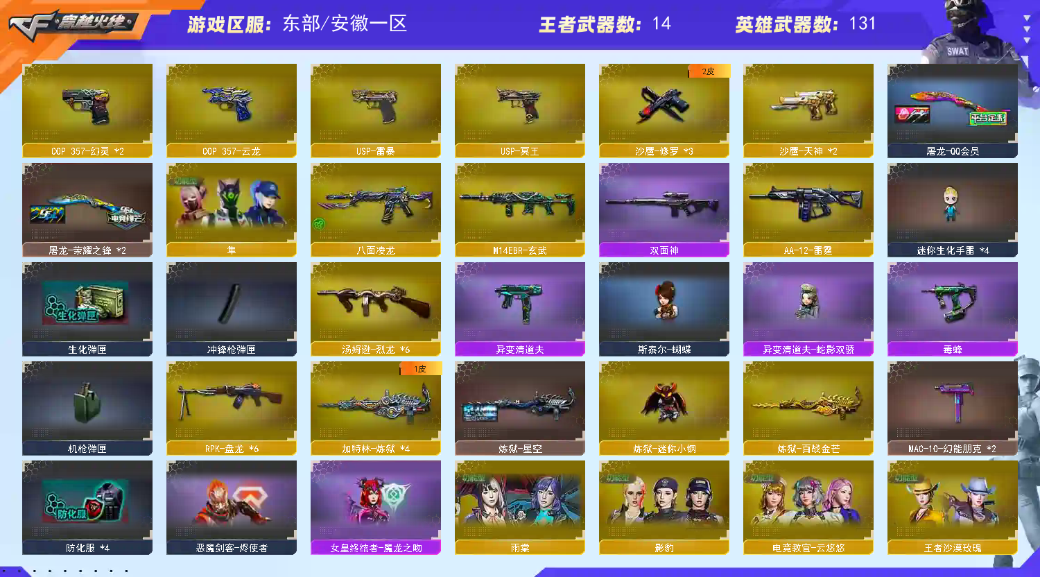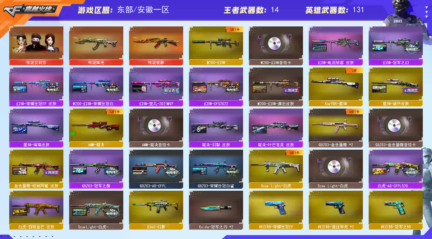 【亮点解析 幻神三件套+7皮 生化六盘六烈+蝴蝶 裁决三件套 Knife-冠军之刃】【四防传说艾莉莎】【M200-幻神+音效卡+幻神电流骇客+幻神-荣耀世冠白鲨+荣耀世冠ep+幻神-宠儿+幻神-CFS2022+幻神-冠军之幻+幻神-黄忠】【竞技荣光套+四防云悠悠+usp雷暴】【Kar98K-星神+破竹+星神-璀璨】【王者星神】【传说辉光】【传说夜影】【G36C-幻影】【王者白虎】【ScarLight-白虎+音效卡+冠军之虎】【QBZ03-金色蔷薇+音效卡+冠军之薇】【生化 6盘龙 4炼狱 6烈龙 异变清道夫 蝴蝶 黄金猫猫手套白鲨】【裁决+音效卡+叶芒苍灵】【Barrett-毁灭+音效卡+毁灭-冠军之怒】【极光+音效卡】【八面凌龙】【AK47-火麒麟+火麒麟-枪娘+火麒麟-冠军之心】【黑龙+音效卡】【M4A1-雷神+雷神-冠军之魄】【黑骑士+音效卡】【王者之武 王者之魄 王者青龙 王者霜心 王者森决】【天启 超新星 hk417-朱雀 玄武】【15手枪 修罗*3 天神*2 usp雷暴 cop幻灵*2 usp冥王 cop云龙 冠军之特 柯尔特-荣耀世冠ep】【21近战 屠龙*2 龙啸*2 擎天 麒麟刺*2 幻灵之峰 王者之啸*2】【手雷 堕天神 夜魔雷 幻灵雷 竞技荣光 云龙雷 雷霆王者】【四防 鹰 隼 王者葵貂蝉 王者潘多拉 王者沙漠玫瑰】【幻神音效卡 裁决音效卡 Barrett-毁灭音效卡 ScarLight-白虎音效卡 QBZ03-金色蔷薇音效卡】
