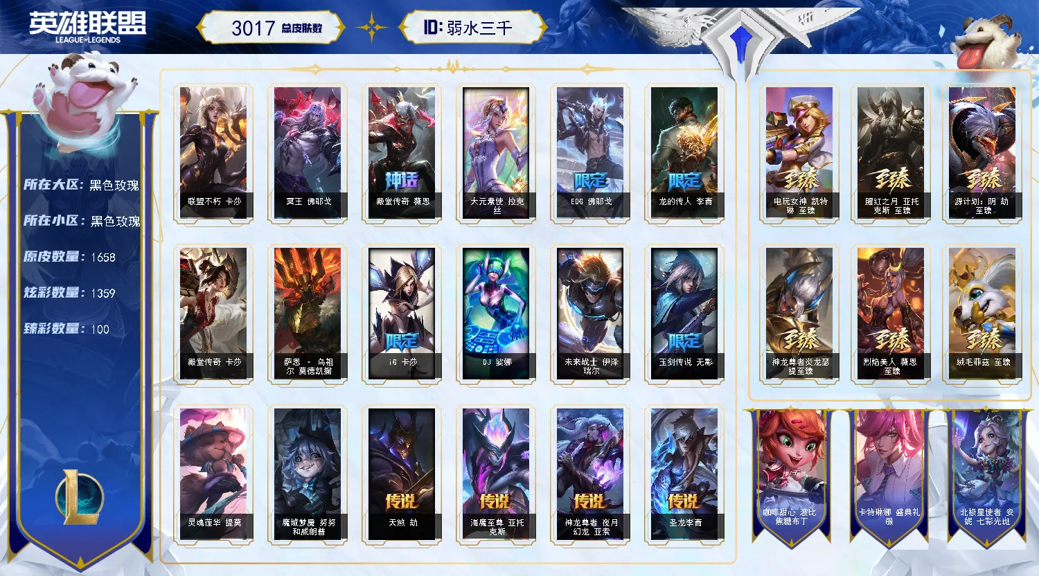 圣堂佛爷戈 联盟不朽卡莎⚡1650原皮⚡圣堂铁男⚡99臻彩⚡粉蓝白龙虾⚡至臻北极星梅尔⚡机神诺手⚡