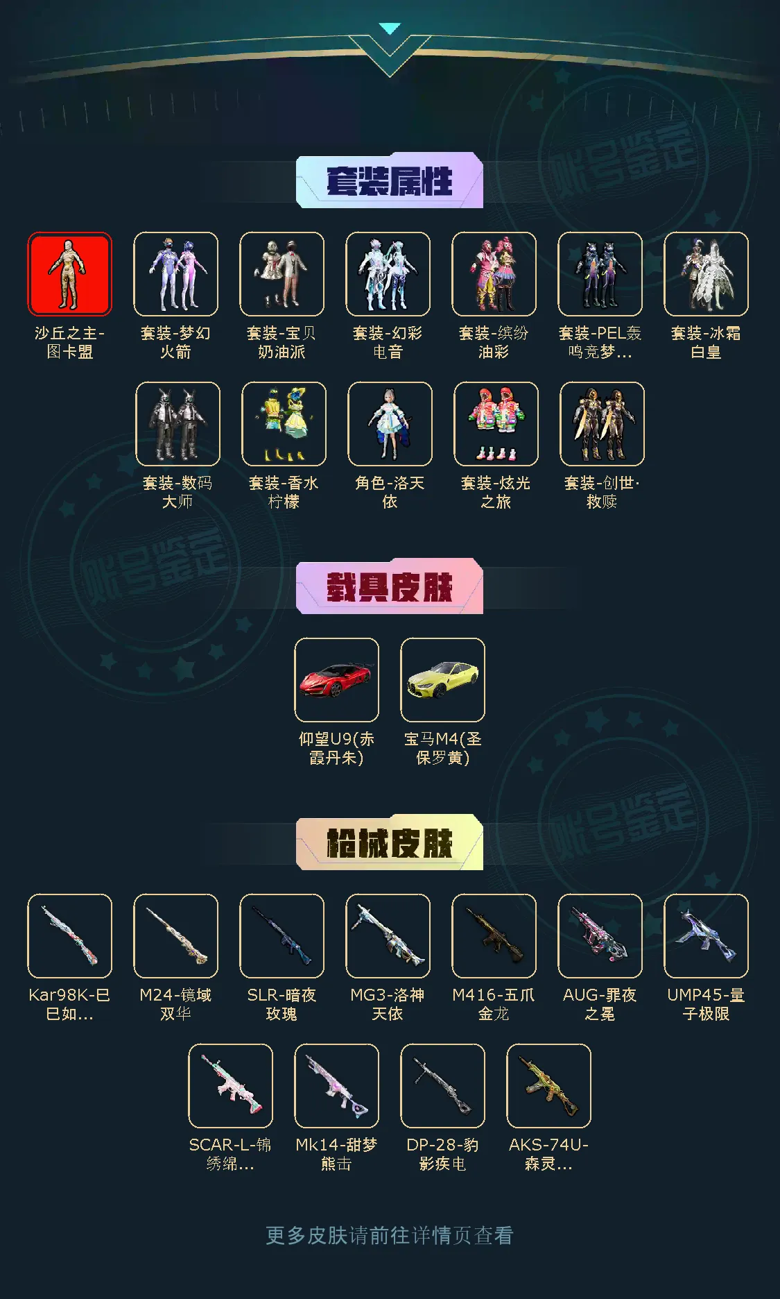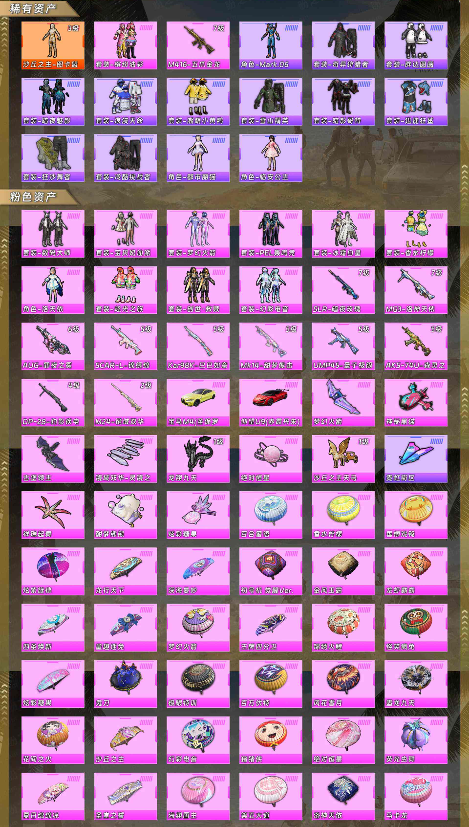 【稀有资产】沙丘之主-图卡盟[3级]/套装-缤纷油彩/M416-五爪金龙/角色-Mark.06/套装-奇异狩猎者/套装-胖达圆圆/套装-暗夜魅影/套装-浪漫天命/套装-潮萌小黄鸭/套装-雪山精英/套装-暗影哥特/套装-迅捷狂鲨/套装-狂沙舞者/套装-冷酷挑战者/角色-都市丽猫/角色-临安公主