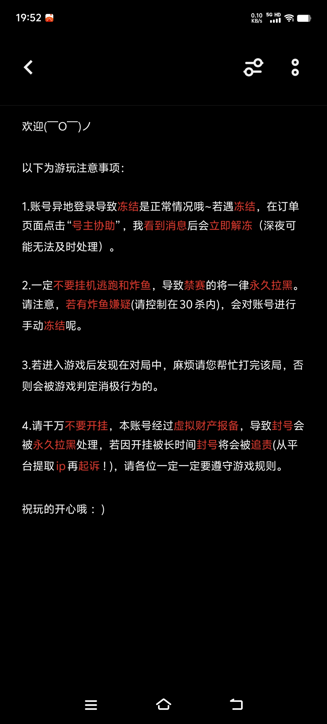 1.账号异地登录导致冻结是正常情况哦~若遇冻结,在订单页面点击“号主协助”,我看到消息后会立即解冻(深夜可能无法及时处理)。