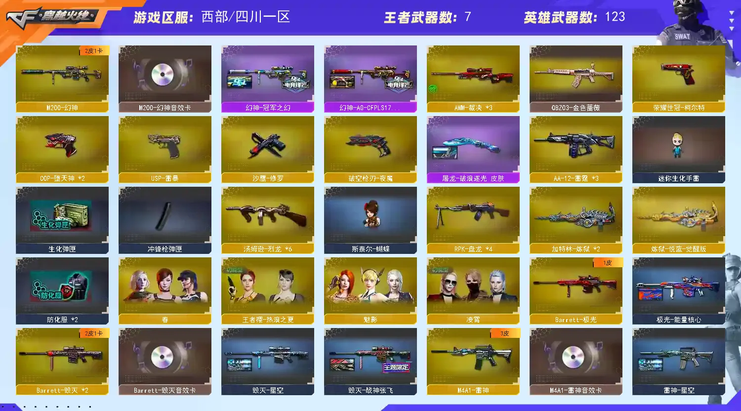 幻神三件套】【M200-幻神+音效卡+幻神-冠军之幻+幻神-AG-CFPLS17】【王者幻神】【QBZ03-金色蔷薇】【生化 4盘龙 3炼狱 6烈龙 蝴蝶 死亡之眼】【裁决】【Barrett-毁灭+音效卡】【极光】【夜魔套】【荣耀世冠-火麒麟】【AK47-火麒麟】【黑龙+音效卡】【M4A1-雷神+音效卡+雷神-传奇n9】【黑骑士】【王者之心】【无影 天启 黑鲨 龙血 hk417-朱雀 青龙 玫瑰精灵 海王】【6手枪 修罗 usp雷暴 cop堕天神*2 荣耀世冠-柯尔特】【14近战 屠龙*4 擎天 麒麟刺*2 斩神刀雷暴 幻灵之锋 】【手雷 雷暴雷 堕天神 夜魔雷 幻灵雷】【四防 职业经理】【角色 凌霄 魅影】【幻神音效卡 M4A1-雷神音效卡 黑骑士音效卡