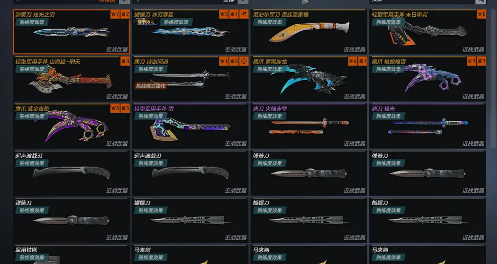 近战:弹簧刀炫光之刃 蝴蝶刀冰刃寒星 尼泊尔军刀贵族皇家橙 轻型军用手斧末日审判 轻型军用手斧山海经刑天 唐刀诗剑问道 鹰爪寒霜冰龙 鹰爪枪娘格雷 鹰爪紫金夜影