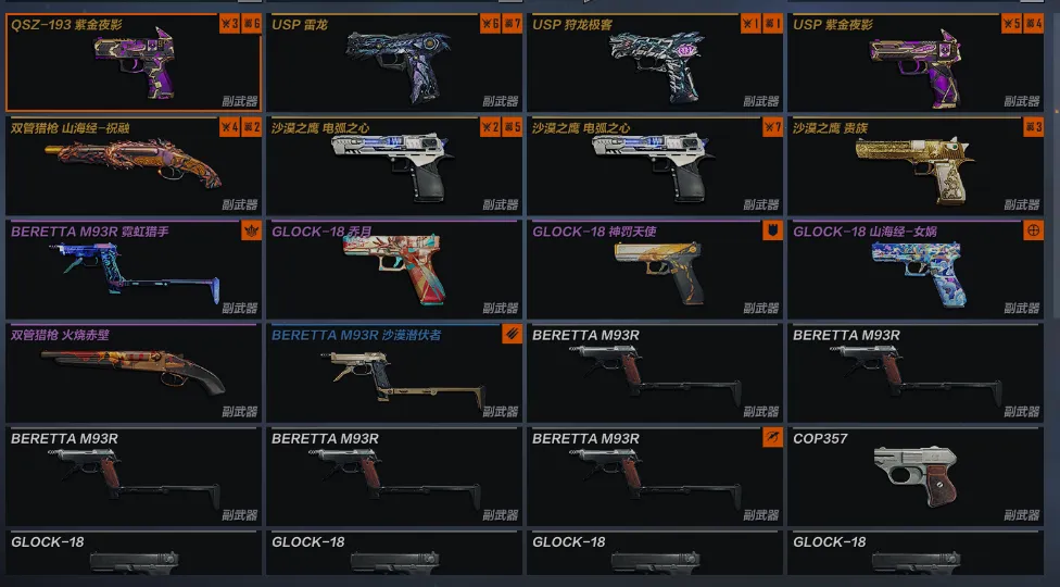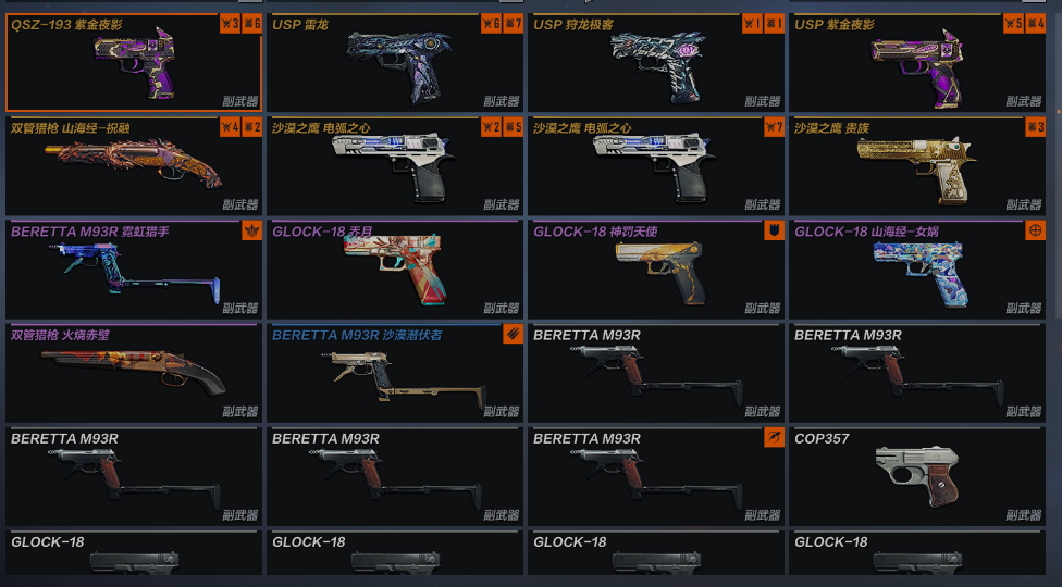副手:QSZ193紫金夜影 USP雷龙 USP狩龙极客 USP紫金夜影 双管猎枪山海经祝融 沙漠之鹰电弧之心X2 沙漠之鹰贵族