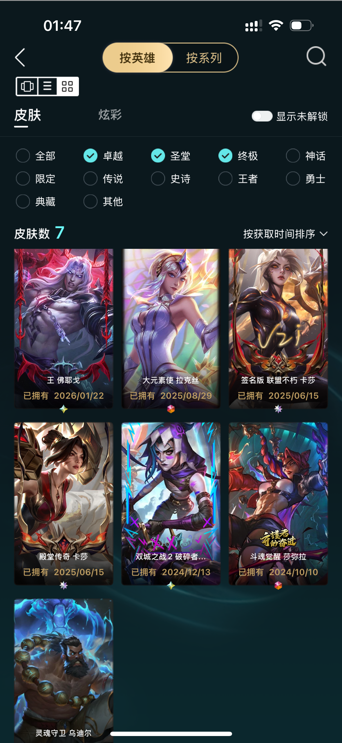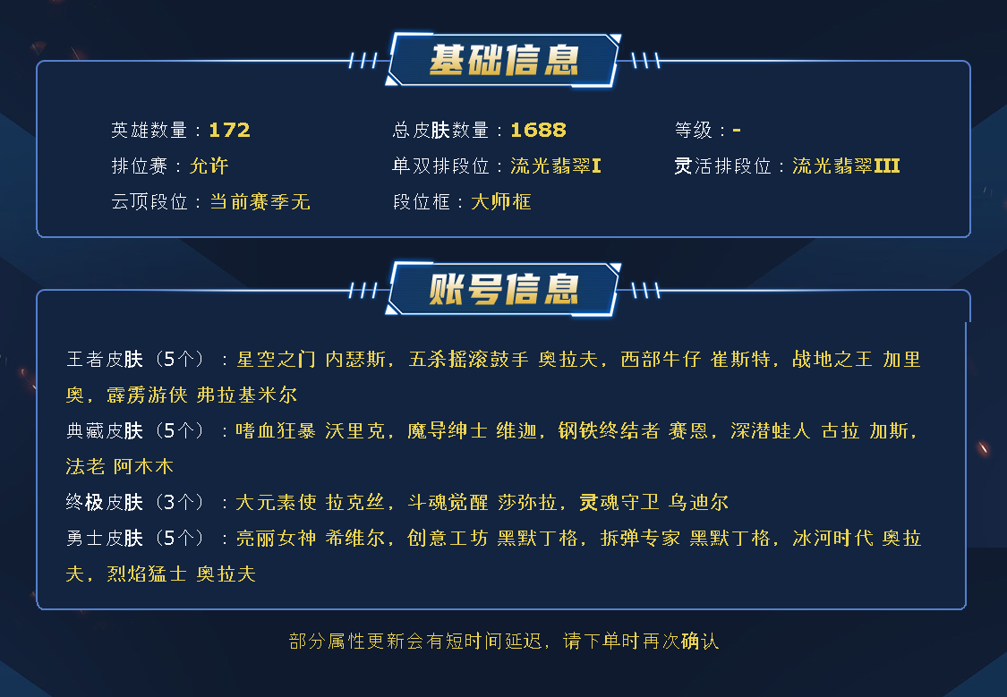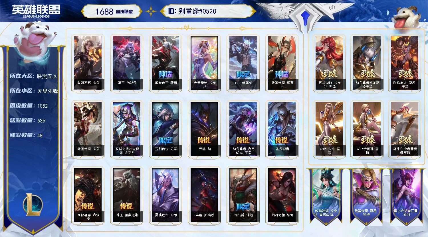 665级联盟五区无畏先锋全英雄,不朽卡莎双圣堂,3终极,圣辉牛仔卢锡安塞纳,上赛季大师隐藏分可排位