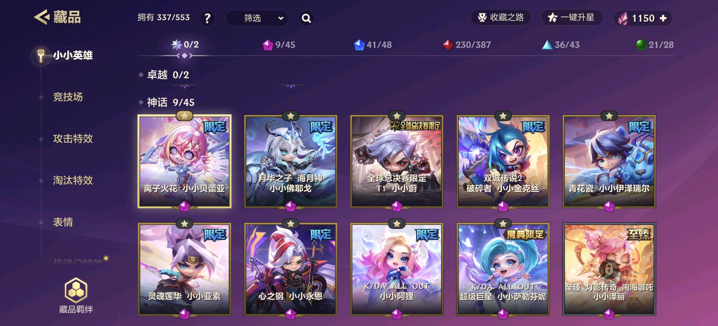 【安卓】 230级337小小英雄/9神话/青花瓷伊泽/KDA阿狸 萨勒芬妮/灵魂亚索/T1蔚/40棋盘